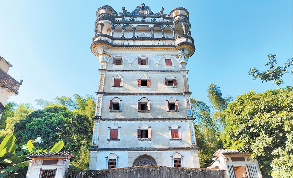 ????瑞石樓樓高28米,不僅是開(kāi)平現(xiàn)存最高的碉樓,更因其樓層之高、外觀之華美而被譽(yù)為“開(kāi)平碉樓第一樓”。近百年來(lái),它一直矗立在錦江里村落的簕竹林里,守護(hù)著這片家園。與碉樓家族的其他成員一樣,瑞石樓匯聚了東西方文化特色,承擔(dān)著保家衛(wèi)國(guó)的歷史重任。以瑞石樓為代表的開(kāi)平碉樓承載著海外華僑與家鄉(xiāng)的故事和情感,在這片僑鄉(xiāng)土地上屹立不倒。
