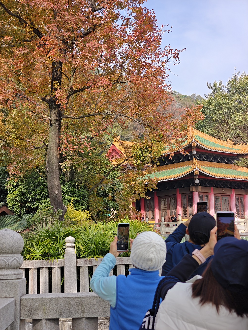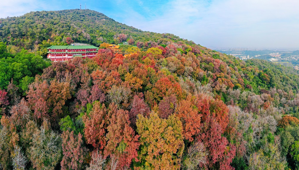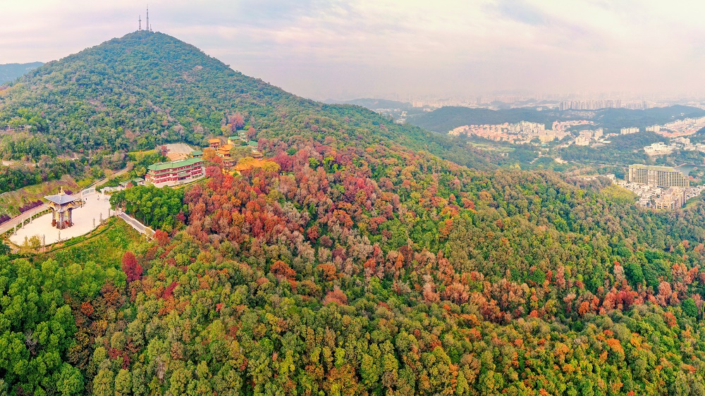 ????12月24日下午,記者順著圭峰山登山古道拾級而上,山上樹木高低掩映,郁郁蔥蔥,沿路可見枝頭楓葉分外紅。在太陽的映照下,粉紅、桃紅、鮮紅、深紅……好像打翻了調(diào)色盤一樣,給蒼郁的圭峰山增添了一分瑰麗,不少市民用手機(jī)記錄下這美好一刻。