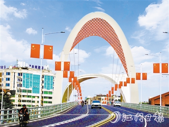 ????記者昨日走上新開通的江門船廠跨江橋發(fā)現(xiàn),橋梁兩邊懸掛著一面面五星紅旗(見上圖),展現(xiàn)蓬江“新年新氣象”;而在長堤歷史文化街區(qū),一排排亮眼、喜慶的紅燈籠高掛,寓意著新的一年將會紅紅火火、幸福美滿。