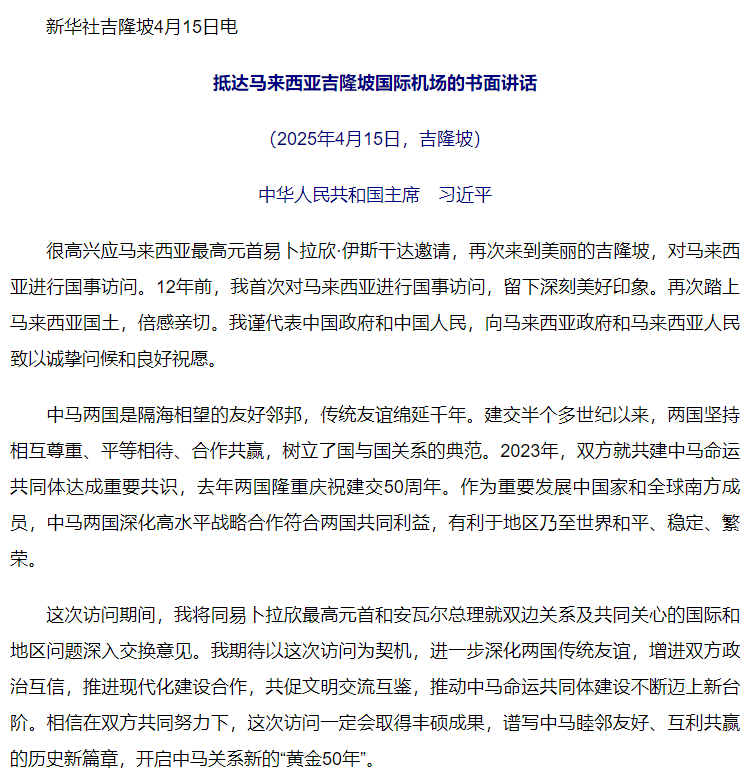 習近平抵達馬來西亞吉隆坡國際機場發(fā)表書面講話
