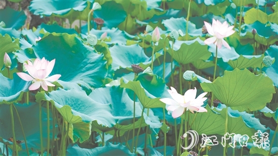 ????江門日?qǐng)?bào)訊 (文/圖 記者/何榕 陳嬋)時(shí)下,外海街道茶庵古寺里的大片荷花開(kāi)始綻放,吸引了不少市民游客前往觀賞、打卡。????記者昨日經(jīng)茶庵古寺門坊,沿蜿蜒的石板路前行,只見(jiàn)荷花池中,荷葉田田,層層疊疊,粉色的、白色的荷花在綠色荷葉間亭亭玉立,與古寺的飛檐斗拱相互映襯,美麗如畫。