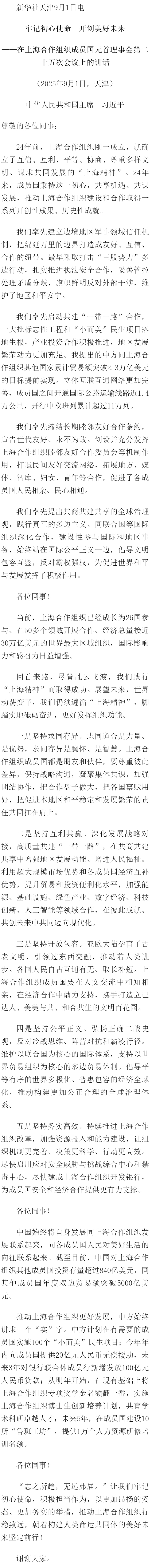 上合組織天津峰會(huì)|習(xí)近平在上海合作組織成員國元首理事會(huì)第二十五次會(huì)議上的講話(全文)