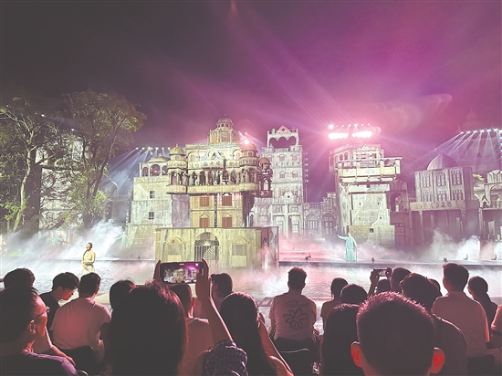 ????晚上8時(shí)30分,赤坎華僑古鎮(zhèn)的晚風(fēng)裹著僑鄉(xiāng)煙火氣,人流循著燈光向水劇場(chǎng)聚攏。不過(guò)半小時(shí),劇場(chǎng)內(nèi)5000余個(gè)座位便座無(wú)虛席,觀(guān)眾手中的手機(jī)鏡頭已悄悄對(duì)準(zhǔn)舞臺(tái)——大家等候的,正是能讓開(kāi)平碉樓故事“穿越時(shí)空”的《火秀》。