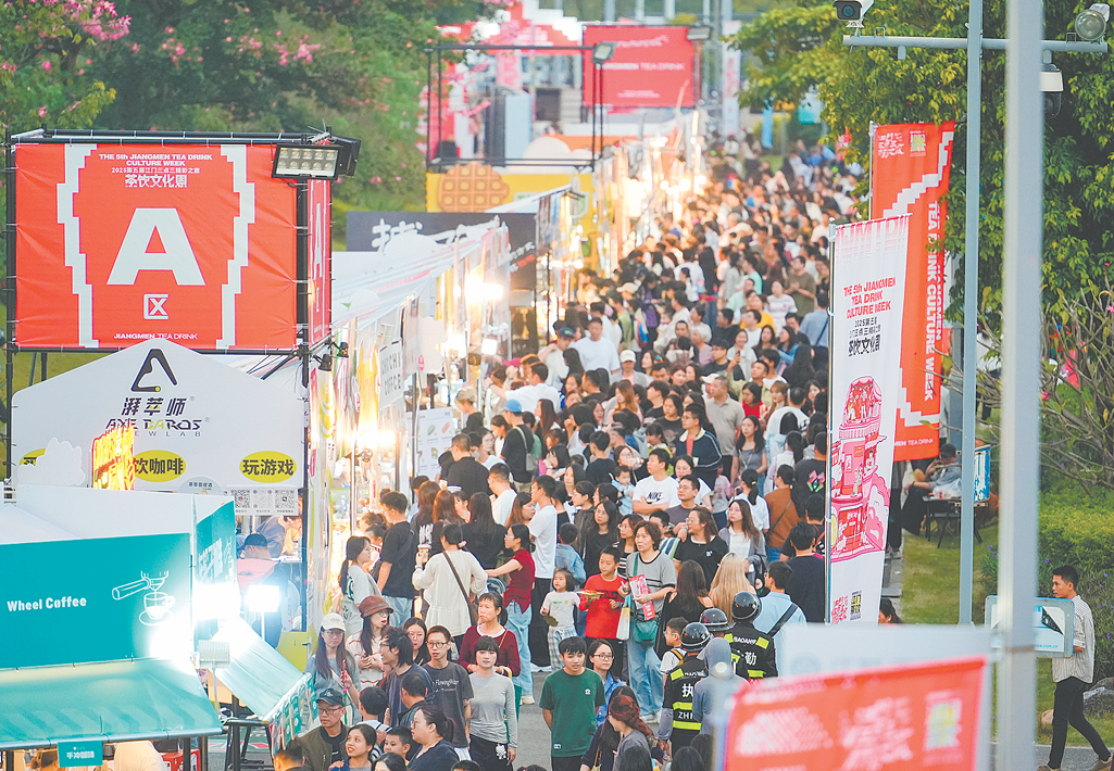 ????□江門日?qǐng)?bào)記者 凌雪敏????傍晚的江門人才島潮頭中央公園,晚風(fēng)裹挾著香水檸檬的清新與茶葉的醇香。一位剛參加完健步走的市民,端起一杯地道的“江門三點(diǎn)三”茶飲,汗水與笑意交織在臉上。不遠(yuǎn)處,外貿(mào)優(yōu)品展銷區(qū)的暖黃燈光下,市民舉著能“唱歌”的棒棒糖,發(fā)出驚喜的贊嘆——這充滿動(dòng)感與“煙火氣”的一幕,正是剛剛落幕的第五屆江門三點(diǎn)三精彩之旅茶飲文化周(以下簡(jiǎn)稱“江門茶飲文化周”)最生動(dòng)的剪影。