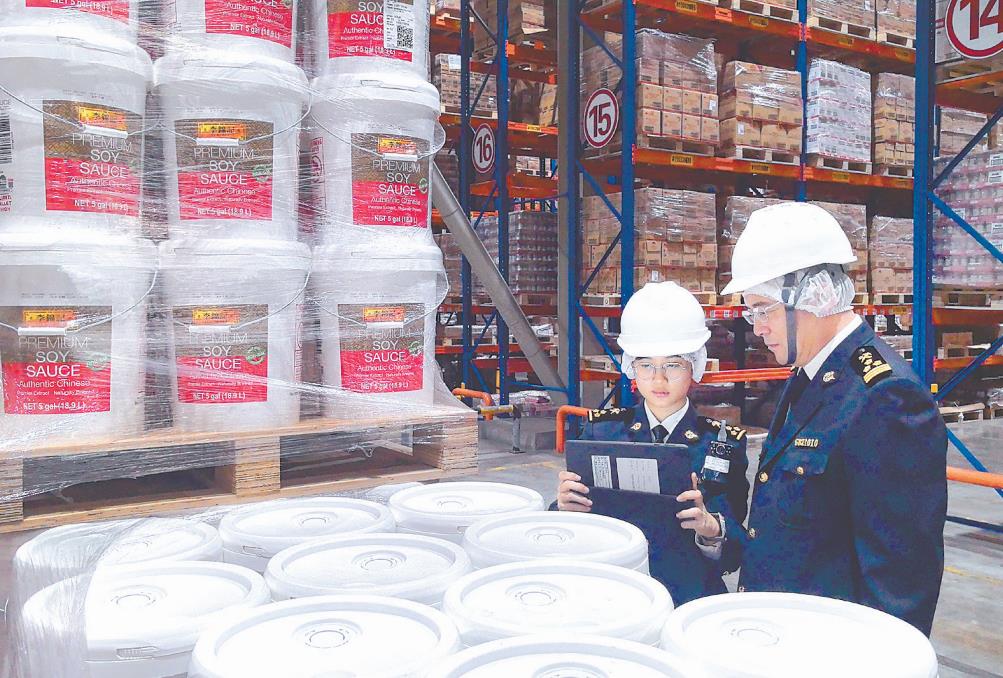 海關(guān)關(guān)員對出口調(diào)味品進(jìn)行監(jiān)管。