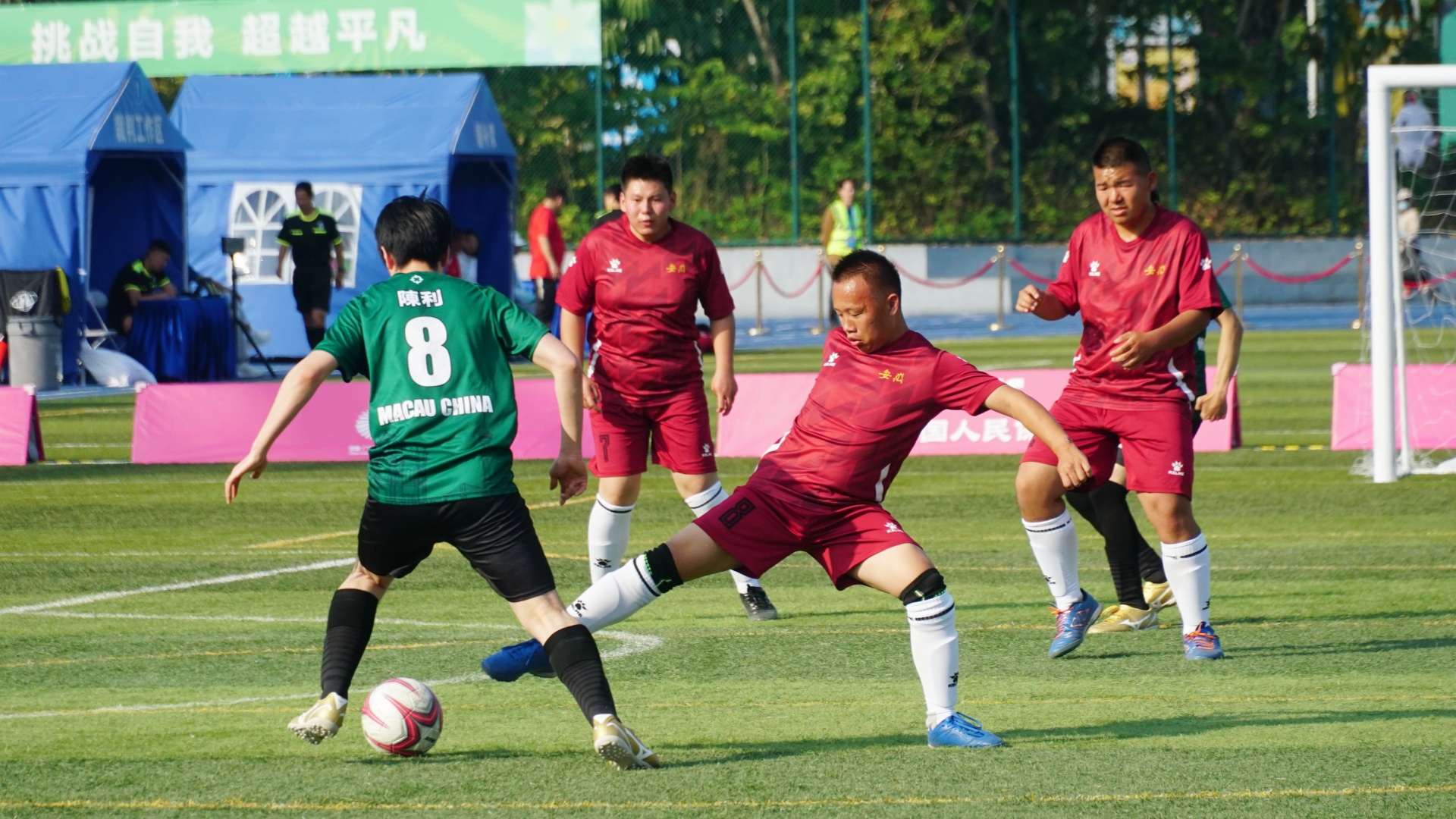 特奧足球運(yùn)動(dòng)員們奔跑、搶球,積極投入比賽。 郭永樂(lè) 攝