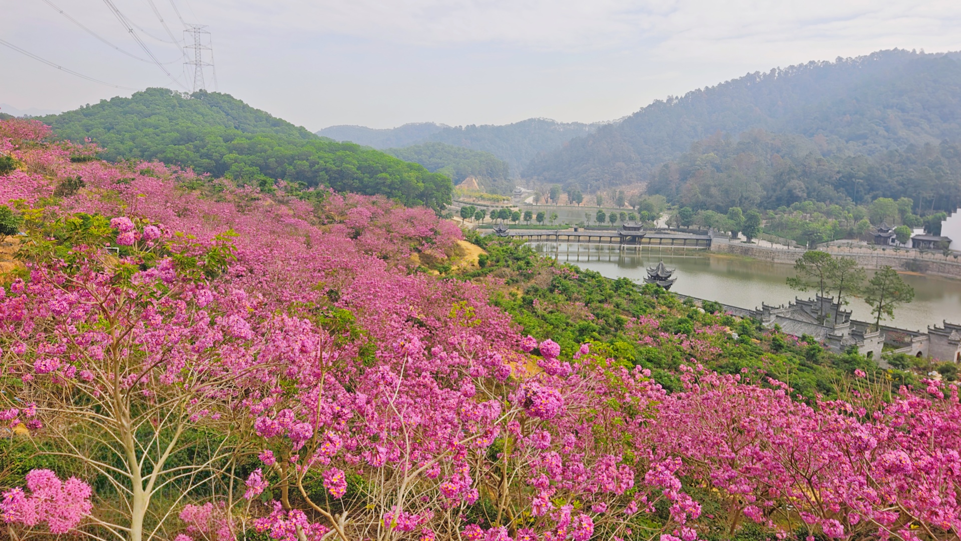 江門(mén)日?qǐng)?bào)訊 (文/圖 記者/郭永樂(lè) 通訊員/魏江琦) 近日,鶴山市共和鎮(zhèn)來(lái)蘇村的紫花風(fēng)鈴木悄然步入盛花期,粉紫色花球垂墜枝頭,如繁星點(diǎn)綴翠綠山巒,這片紫色花海與青磚黛瓦的古村建筑相映成趣,如同走進(jìn)童話世界。