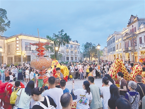 走進(jìn)開(kāi)平赤坎華僑古鎮(zhèn),延綿3公里的600多座古建筑被綠樹(shù)繁花簇?fù)?,歷史風(fēng)貌與現(xiàn)代煙火氣在此交織共生。游客穿梭街巷,舉著相機(jī)定格中西合璧的建筑美學(xué),或是現(xiàn)場(chǎng)感受舞龍、醒獅非遺表演的傳統(tǒng)文化之美。