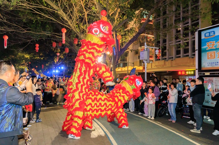 在“奇思妙享趣江?!痹┗顒又?,江南路夜光醒獅巡游亮相,眾多市民游客駐足觀賞。