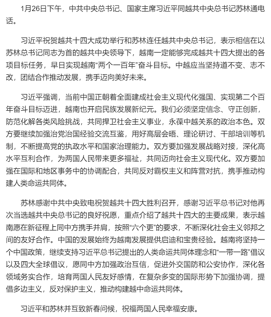 習(xí)近平同越共中央總書記蘇林通電話