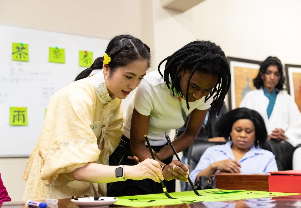 ??△2025年4月17日,在南非約翰內(nèi)斯堡,學(xué)生與孔子學(xué)院志愿者在“國際中文日”活動上寫毛筆字。