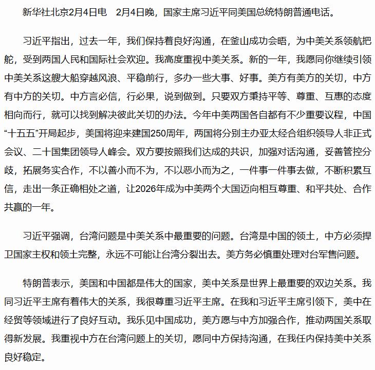 習(xí)近平同美國(guó)總統(tǒng)特朗普通電話