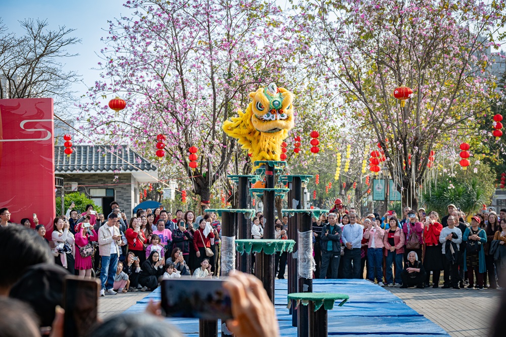 連日來,江海區(qū)江南街道舉辦“龍騰江海、騏驥迎新”新春主題系列活動。圖為市民游客在下沙公園觀看高樁醒獅表演。伴隨著鏗鏘有力的鑼鼓聲,醒獅時而凌空躍樁,時而探身采青,驚險刺激的表演贏得觀眾陣陣掌聲?;顒訉⒊掷m(xù)至大年初七。