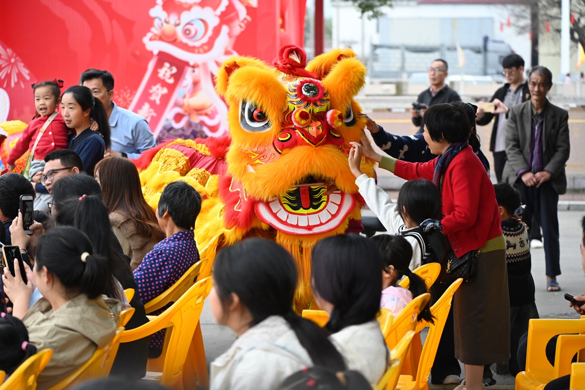 大年初一至初五,新會區(qū)崖門鎮(zhèn)京梅村舉行蔡李佛“武”動京梅活動。圖為大年初一,醒獅與游客近距離互動。獅頭時而俏皮眨眼,時而俯身輕探,讓游客摸摸頭,場面喜慶又熱鬧。