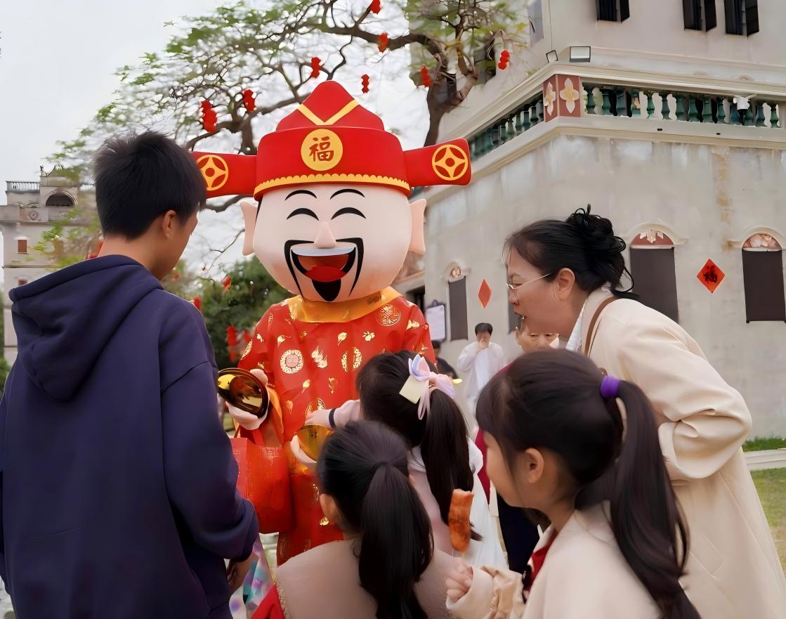 今年春節(jié),開平碉樓文化旅游區(qū)張燈結(jié)彩,青灰碉樓綴滿中國紅,新春氛圍感拉滿。圖為財神爺給游客派發(fā)福氣糖果。