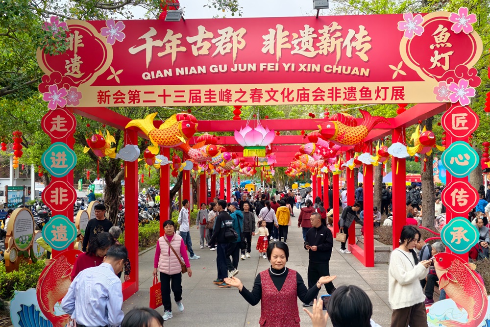 大年初一,新會第二十三屆圭峰之春文化廟會在圭峰山永鎮(zhèn)山門廣場拉開帷幕。本屆廟會以“嶺南文化儒家頌,名山綠水圭峰傳”為主題,于正月初一至初三舉行?;顒右杂梨?zhèn)山門廣場為主會場,并在圭峰演藝廣場、圭峰兒童公園、新會石戲臺設(shè)立三個分會場?,F(xiàn)場,茅龍筆書法、新會魚燈、小岡香等僑鄉(xiāng)非遺技藝集中亮相。