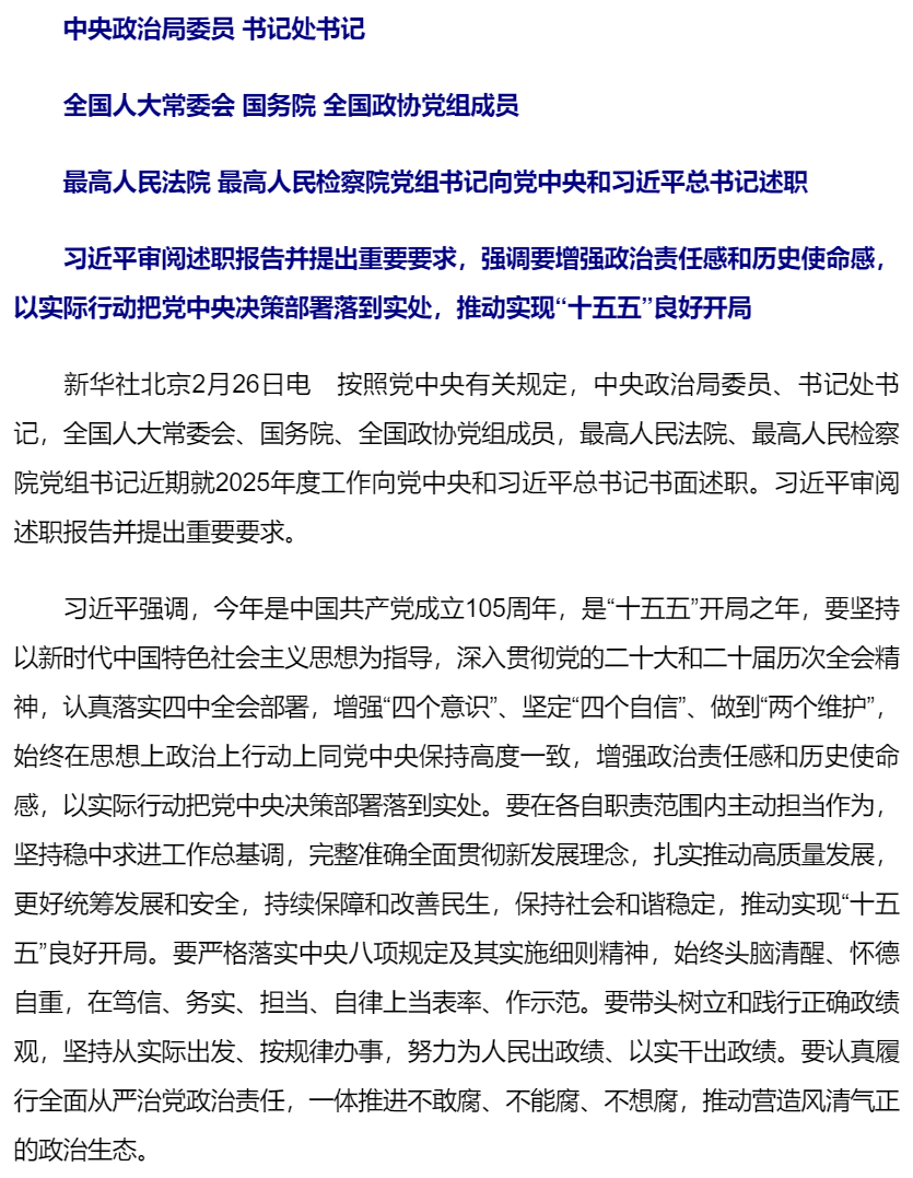 中央政治局委員、書記處書記等向黨中央和習(xí)近平總書記述職