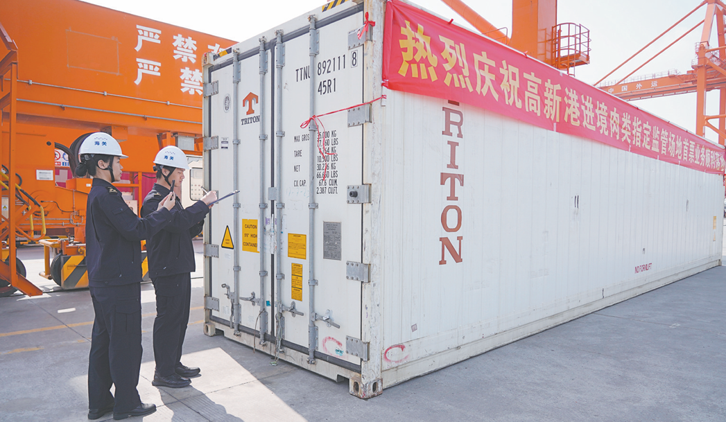 ????江門日?qǐng)?bào)訊 (文/圖 記者/凌雪敏 何榕) 3月11日,江門高新港進(jìn)境肉類指定監(jiān)管場(chǎng)地迎來首票業(yè)務(wù)通關(guān):一批自英國(guó)啟運(yùn)、重72.6噸、總值超150萬元的冷凍豬手,在運(yùn)抵江門高新港后,經(jīng)江門海關(guān)所屬外海海關(guān)監(jiān)管順利放行。這標(biāo)志著該指定監(jiān)管場(chǎng)地正式投入運(yùn)營(yíng),也意味著江門在構(gòu)建高水平對(duì)外開放新格局、賦能本地農(nóng)產(chǎn)品基地建設(shè)上邁出關(guān)鍵一步。????“從貨物抵港到完成查驗(yàn),流程非常順暢?!笔灼睒I(yè)務(wù)進(jìn)口商、恩平市云合貿(mào)易進(jìn)出口有限公司總經(jīng)理馬小紅表示,過去進(jìn)口豬肉需從廣州南沙、深圳鹽田等口岸入境,江門高新港進(jìn)境肉類指定監(jiān)管場(chǎng)地啟用后,如今貨物經(jīng)香港轉(zhuǎn)運(yùn)后,可以直接在江門“直提上岸”,清關(guān)完成后即可運(yùn)往本地冷庫,再銷往全國(guó)。“提貨速度快了整整一天,在家門口有了冷庫,也省去了異地倉儲(chǔ)費(fèi)用?!彼硎?,專業(yè)的冷鏈設(shè)施與高效的通關(guān)服務(wù),有力保障了肉品品質(zhì),也為企業(yè)拓展業(yè)務(wù)增添了信心。