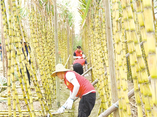 △身著紅馬甲的黨員志愿者在蔗林砍收甘蔗。