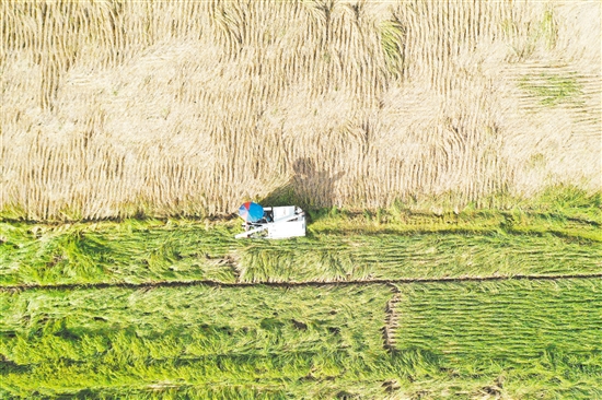 新會區(qū)大鰲鎮(zhèn)農(nóng)業(yè)發(fā)達,土地肥沃,水質(zhì)優(yōu)良,是著名的“魚米之鄉(xiāng)”。近日,大鰲鎮(zhèn)早造水稻陸續(xù)收割,奏響了豐收的序曲。記者在大鰲鎮(zhèn)新一村、東風村、大鰲尾村等地見到,稻田一片金黃,豐收在望,田野上機器轟隆,引來無數(shù)燕子在上空翩翩起舞。