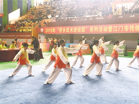 綠色的太極服在推揉間盡展飄逸,橙色的長(zhǎng)拳服在舞動(dòng)間凸顯活潑,黑色的南拳服在拳式下流露剛勁……
