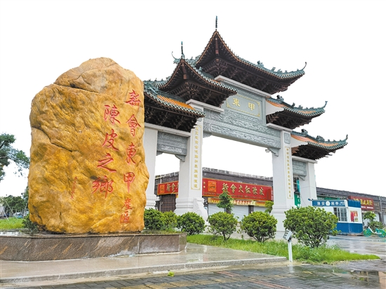 這是會城街道東甲村古老牌樓上的楹聯(lián)。東甲村位于新會舊城區(qū)之東,臨近江門大道東甲立交和新會城軌站,隔江門水道毗鄰江海禮樂,是新會有名的古村。據(jù)史料記載,東甲村于明初開村,已有600多年歷史,底蘊深厚。